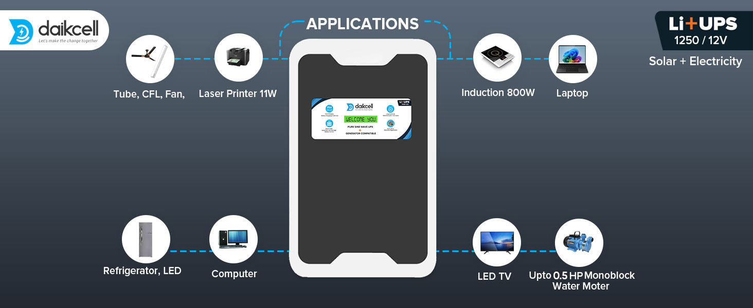 daikcell 3 in 1 inbuilt Lithium-ion Inverter Battery for Home | Solar+Electricity Charging | Pure Sinewave 1100VA/12V | 1280Wh with 15 Year Life | Wall-Mountable | 5 Year Replacement Warranty – 1KVA